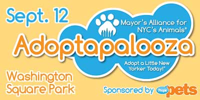 If you're in NYC today you will probably be at Adoptapalooza, no? I know I would. It is simply going to be THE event of the year is all. I won't be able to attend, (maybe next year, if Blog Mom has two functioning legs, we can do it.) but my alma mater will be there fur sure. It's at Washington Square Park in the Village. All doggies are invited. You don't have to be up for adoption to go. AND, you can bring your humans, too. There is something for everydog there including a fashion show, massages, training demos - just all kinds of things to do and experience. What's not to like? And of course, there will be masses of adorable, adoptable pets there. That's the main point, isn't it?
